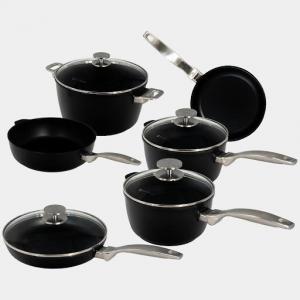 The cookware is crafted from pressure-cast aluminum for even heat distribution and resistance to warping. Each pan features: